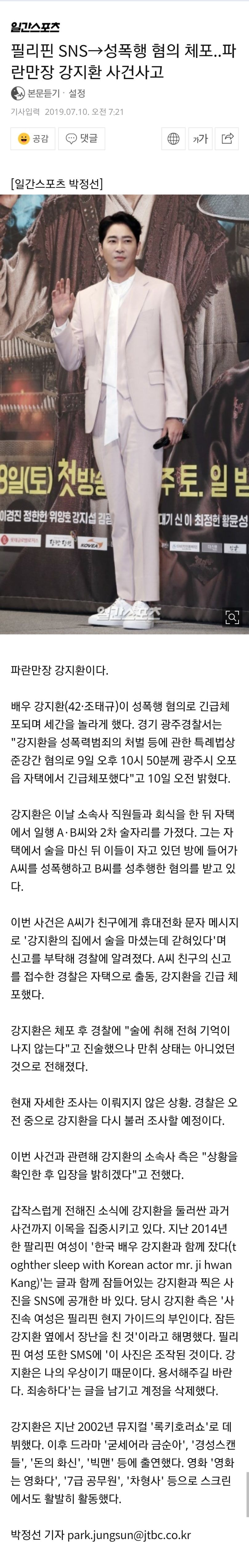 배우 강지환이 잠자던 여성 두 명을 준강간한 혐의로 경찰에 긴급 체포돼 조사를 받고 있는 가운데, . 소속사 여직원 성범죄 혐의로 곤혹을 겪고 있는 강지환! 현재 tv조선 드라마 '조선생존기'에 출연 중인 배우 강지환이 성폭행 혐의로 경찰에 긴급체포됐다. 주다영 기자 @ 이코노미톡뉴스 강지환의 필리핀 사진에 얽힌 사연이 회자되고 있다. 최근 방송된 채널a 예능프로그램 '풍문으로 들었쇼'에서는 .